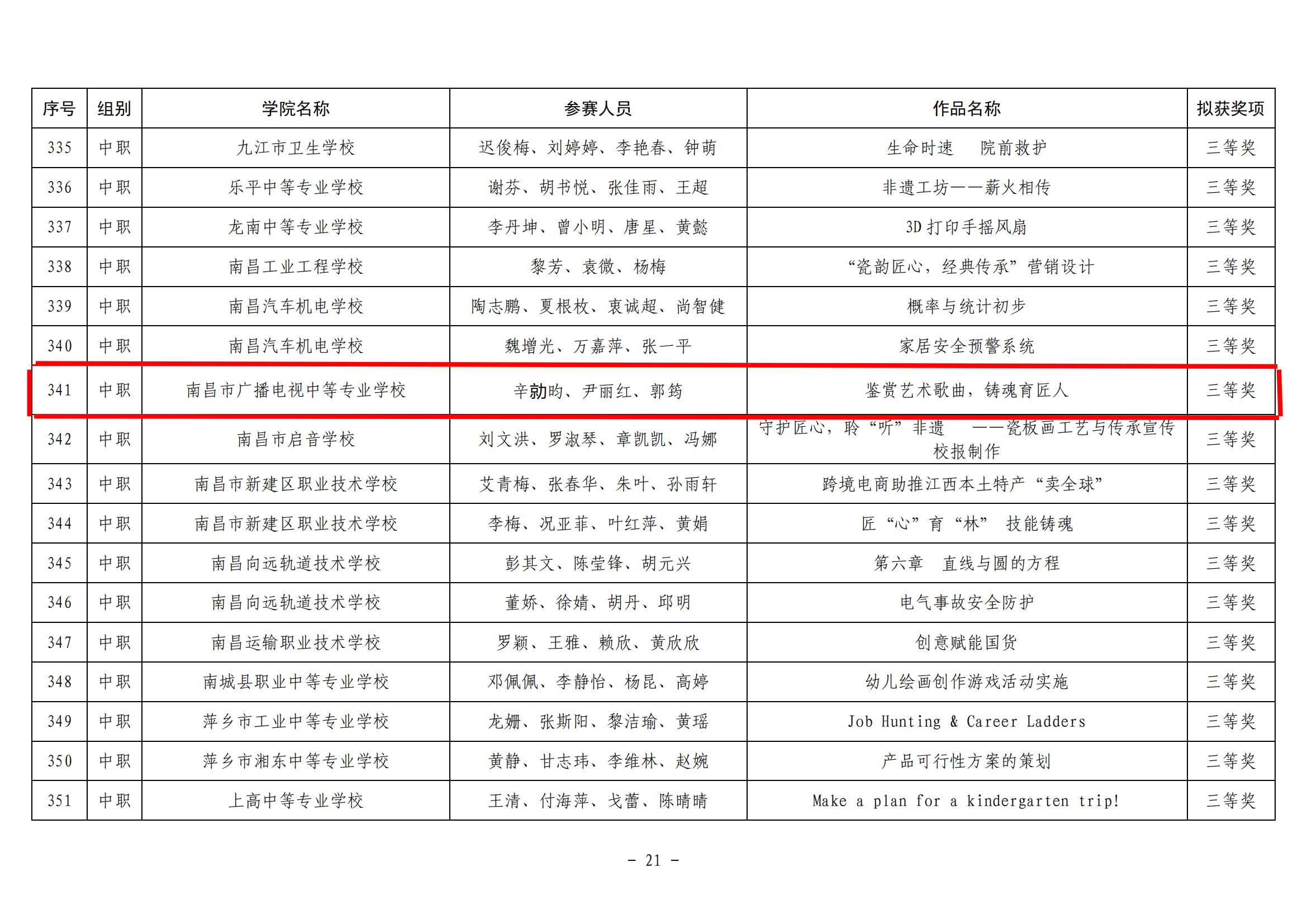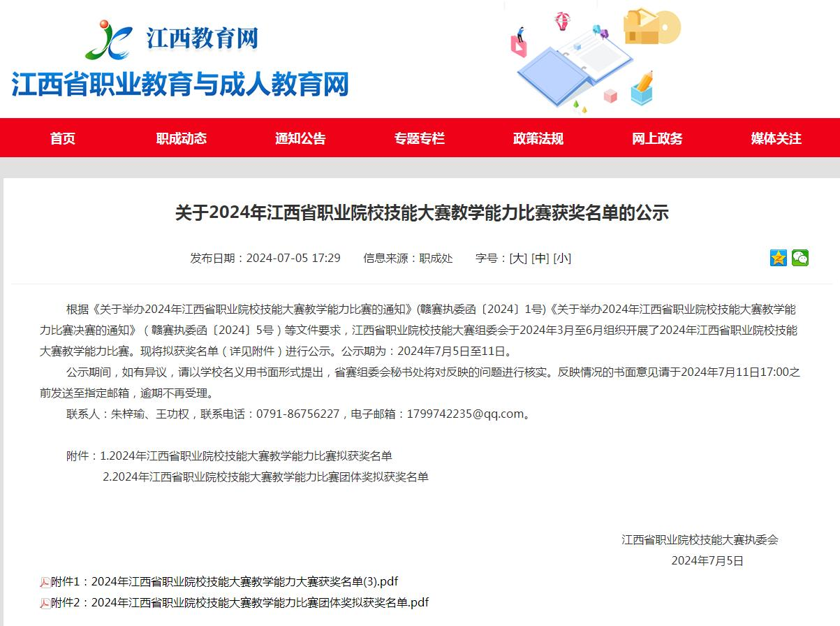 近日,省教育厅印发《关于2024年江西省职业院校技能大赛教学能力比赛获奖名单的公示》,我校音乐教研组尹丽红、辛勍昀、郭筠3名老师组成的教师团队,在2024年江西省职业院校技能大赛教学能力比赛中荣获大赛中职组三等奖。