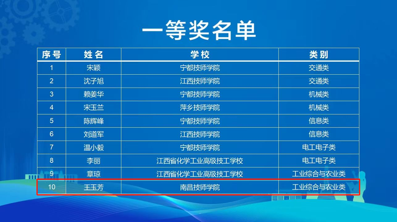 近日,备受瞩目的江西省第三届教师职业能力大赛决赛在萍乡市圆满闭幕,南昌技师学院选派的3名教师在众多参赛教师中脱颖而出,斩获佳绩。王玉芳老师荣获工业综合和农业类教学赛一等奖,朱程睿老师荣获班主任赛二等奖,李剑老师荣获信息类教学赛三等奖。