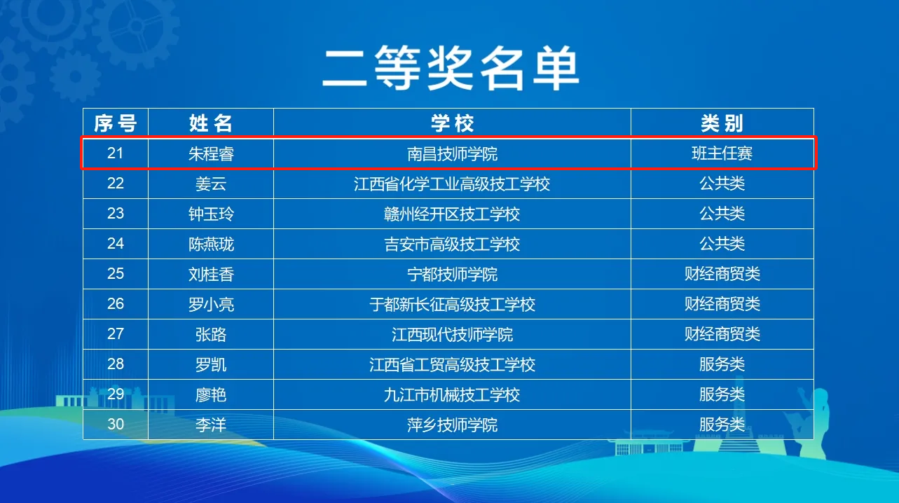 本次大赛由江西省人力资源和社会保障厅主办,以“正心树德 技能育人”为核心主题,设教学赛和班主任赛2个赛项共10个类别。经过层层选拔,来自全省的100名精英教师齐聚一堂展开激烈角逐。我院的三位参赛教师凭借深厚扎实的专业理论功底、精湛的教学技艺以及坚韧不拔的进取精神,在赛场上大放异彩,最终全部获奖!